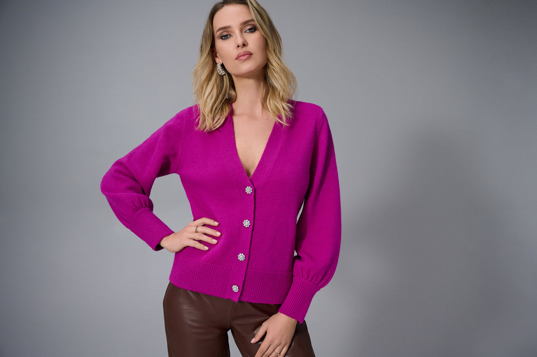 Fuchsia Knit Cardigan with Diamante Buttons | V Neck Crystal Button Cardi Australia