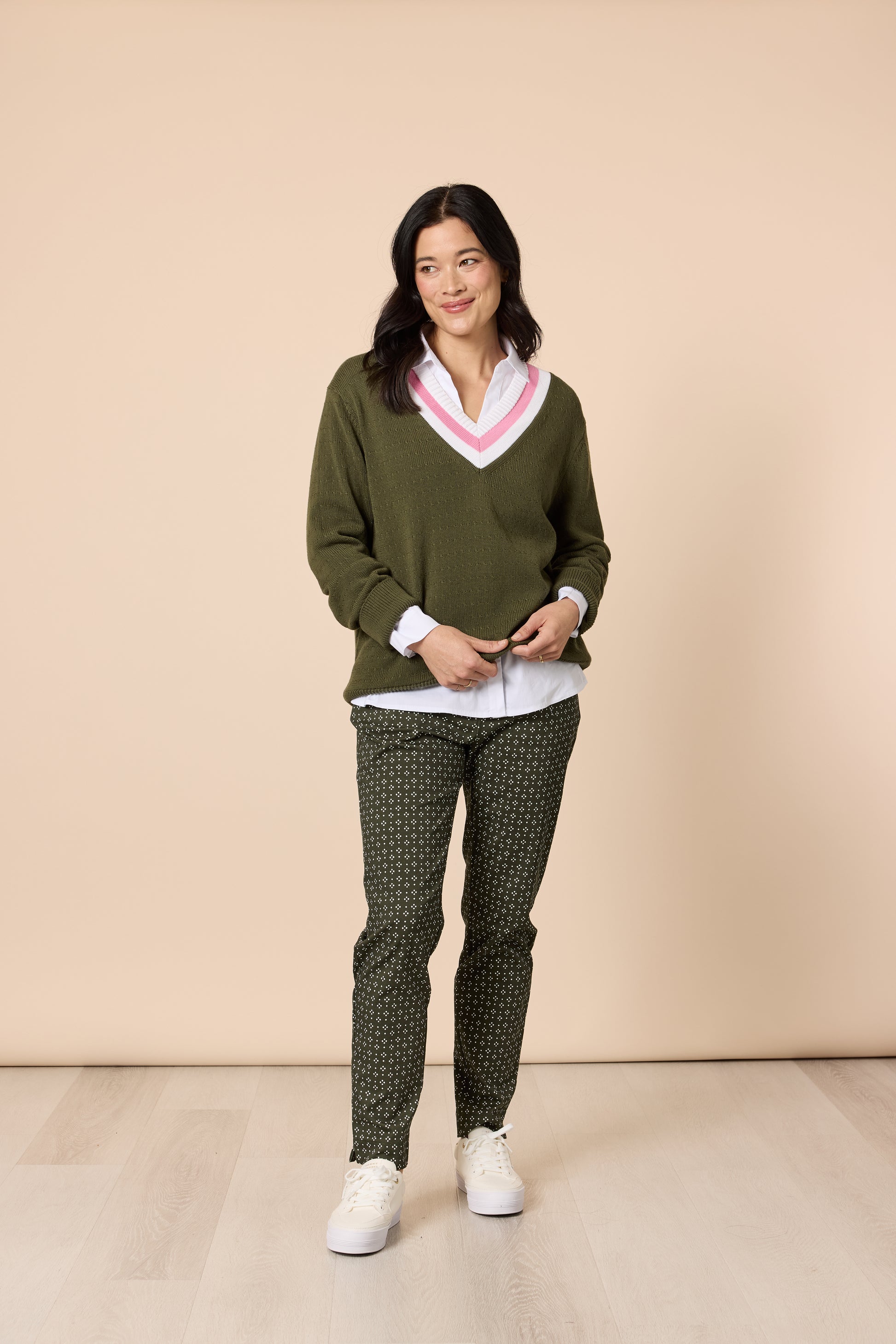 Effortless layering meets refined detail in the Khaki V Neck Knit Jumper with Pink White Trim, a versatile essential designed for polished everyday dressing. Available exclusively at Showies Boutique in Adelaide, this knit blends comfort, structure, and subtle colour contrast.